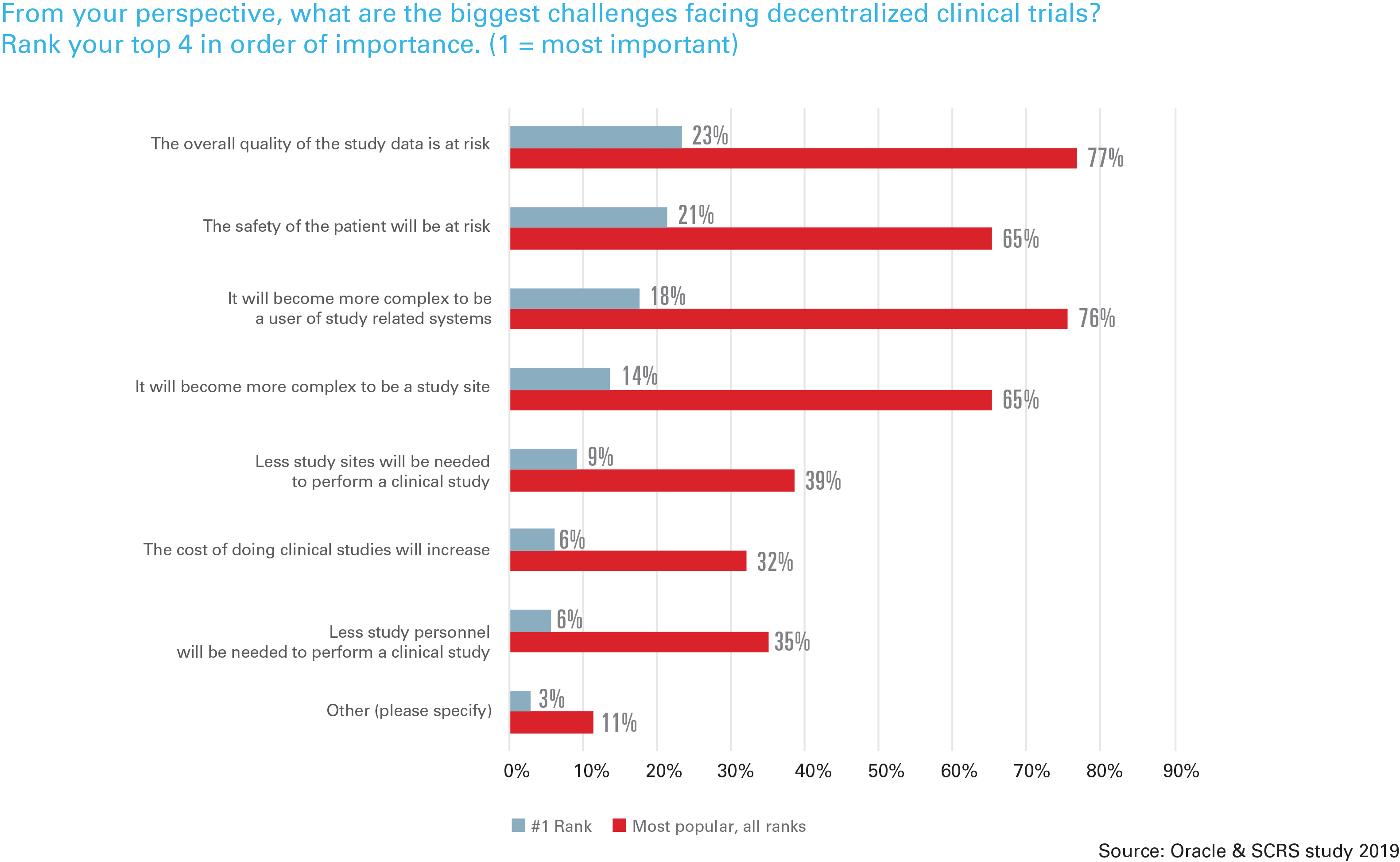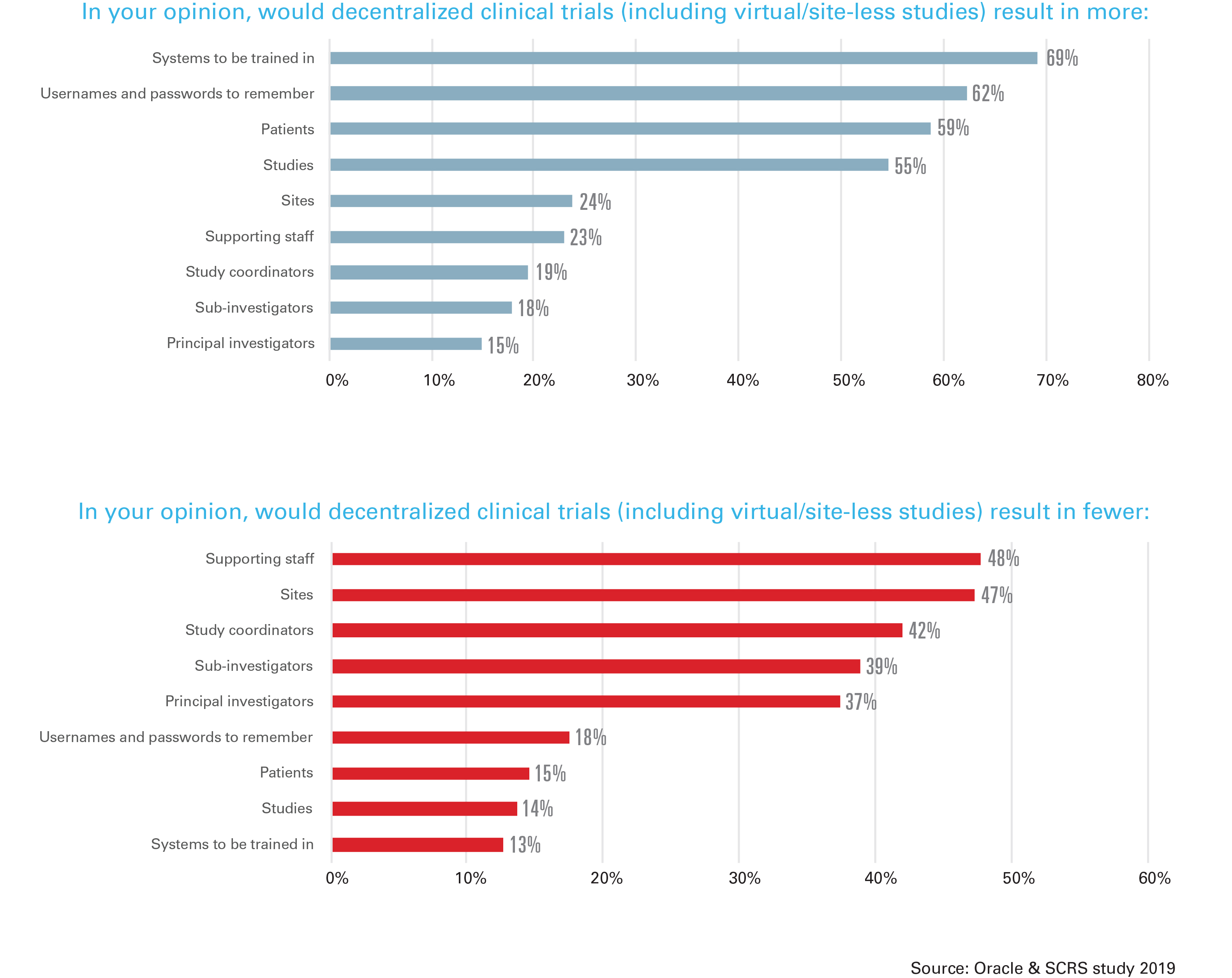 While respondents cited greater patient participation (82%) and patient access (71%) as positive anticipated benefits, they cited more systems to be trained in (69%), more usernames and passwords (62%), and fewer sites (47%) and staff (48%) as negative anticipated results. In addition, respondents expressed concern about the overall study data quality with a decentralized model, and 65% worried that the patient’s safety would be at risk with a decentralized model. Distance to a study site and the frequency of required visits was mentioned by all respondents as an enrollment challenge.
