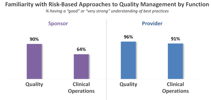 Breaking this down further, among providers, understanding of risk-based quality management was consistent by function across Quality and Clinical Operations. However, among sponsors, those in Clinical Operations expressed a substantially lower level of familiarity than did those representing the Quality function.